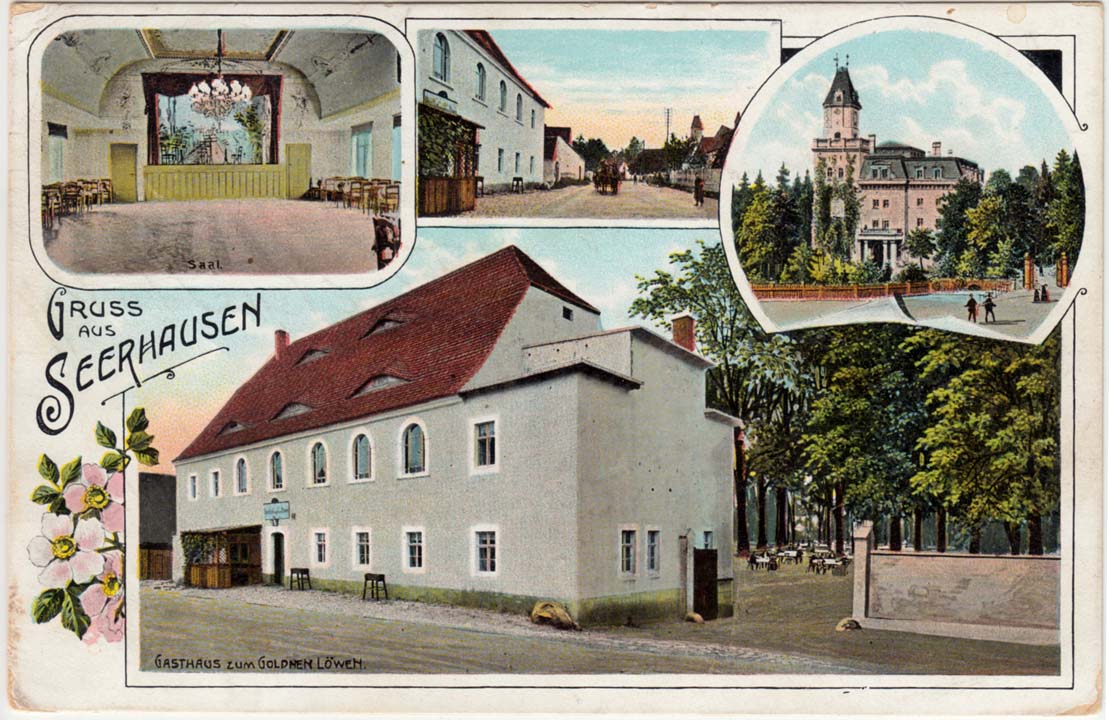 Gasthaus zum Goldenen Löwen, Saal im Gasthaus, Poststraße/Via Regia in südlicher Richtung, Schloss Seerhausen
