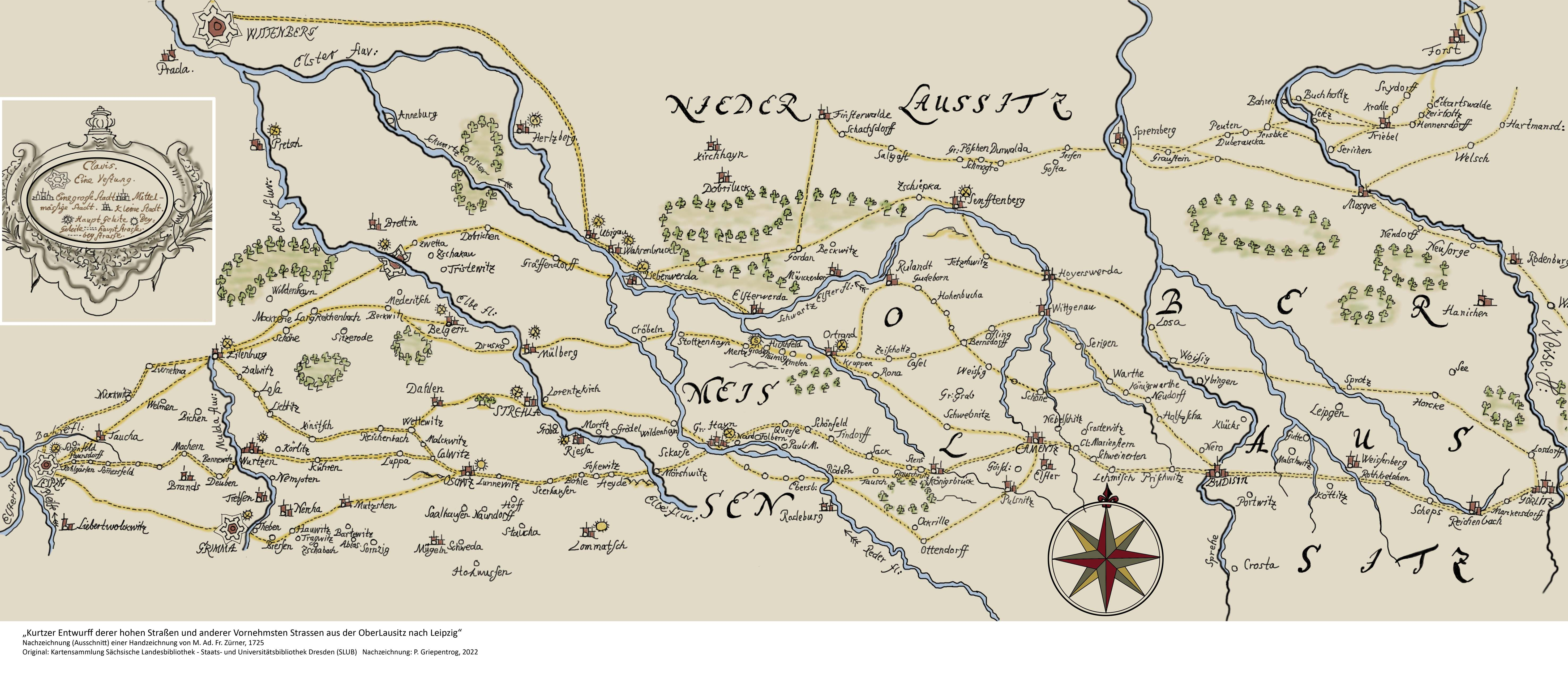 Kurtzer Entwurff derer hohen und anderen Vornehmsten Strassen aus der Ober Lausitz nach Leipzig So wohl aus denen Sichersten, denen oben zu getheilten Längen und breiten Herrn Beintels und anderer, als auch aus vielen Special Charten, Rissen, und nachrichten die man hierzu bekommen können, auf befehl zusammen gezogen