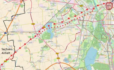Karte hergestellt aus OpenStreetMap-Daten | Lizenz: Open Database License (ODbL) Einzeichnung der Trassenverläufe: P. Griepentrog, 2023