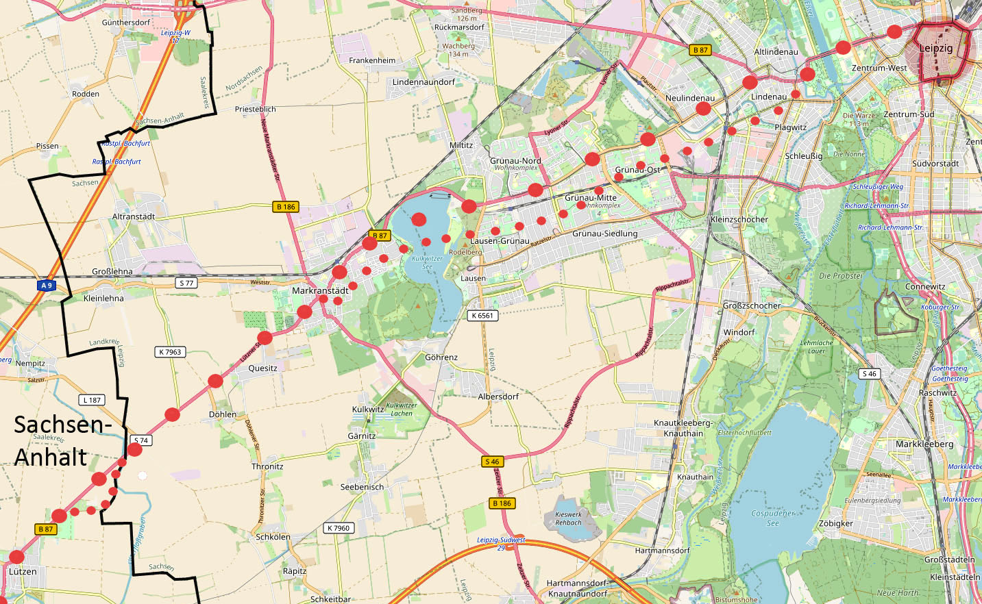 Landesgrenze Zwischen Lützen und Markranstädt überschreitet die von Frankfurt/M., über Erfurt und Naumburg kommende VIA REGIA als heutige B 87 mit der Elsterfloßgraben-Brücke die Landesgrenze zwischen Sachsen-Anhalt und Sachsen.
