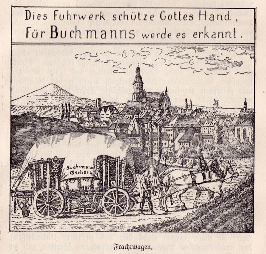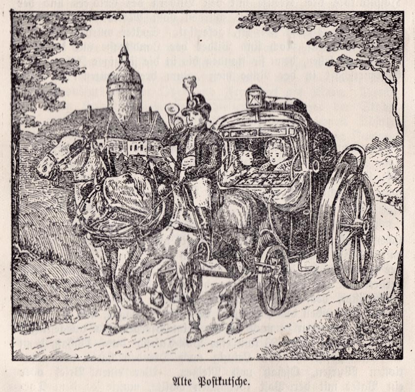 Es melden Bücher und Sagen so manches Wunderding von einem gelben Wagen, der durch die Lande ging. Die Kutsche fuhr – man denke! – des Tags sechs Meilen weit und hielt an jeder Schenke – O du gute, alte Zeit. Baumbach.