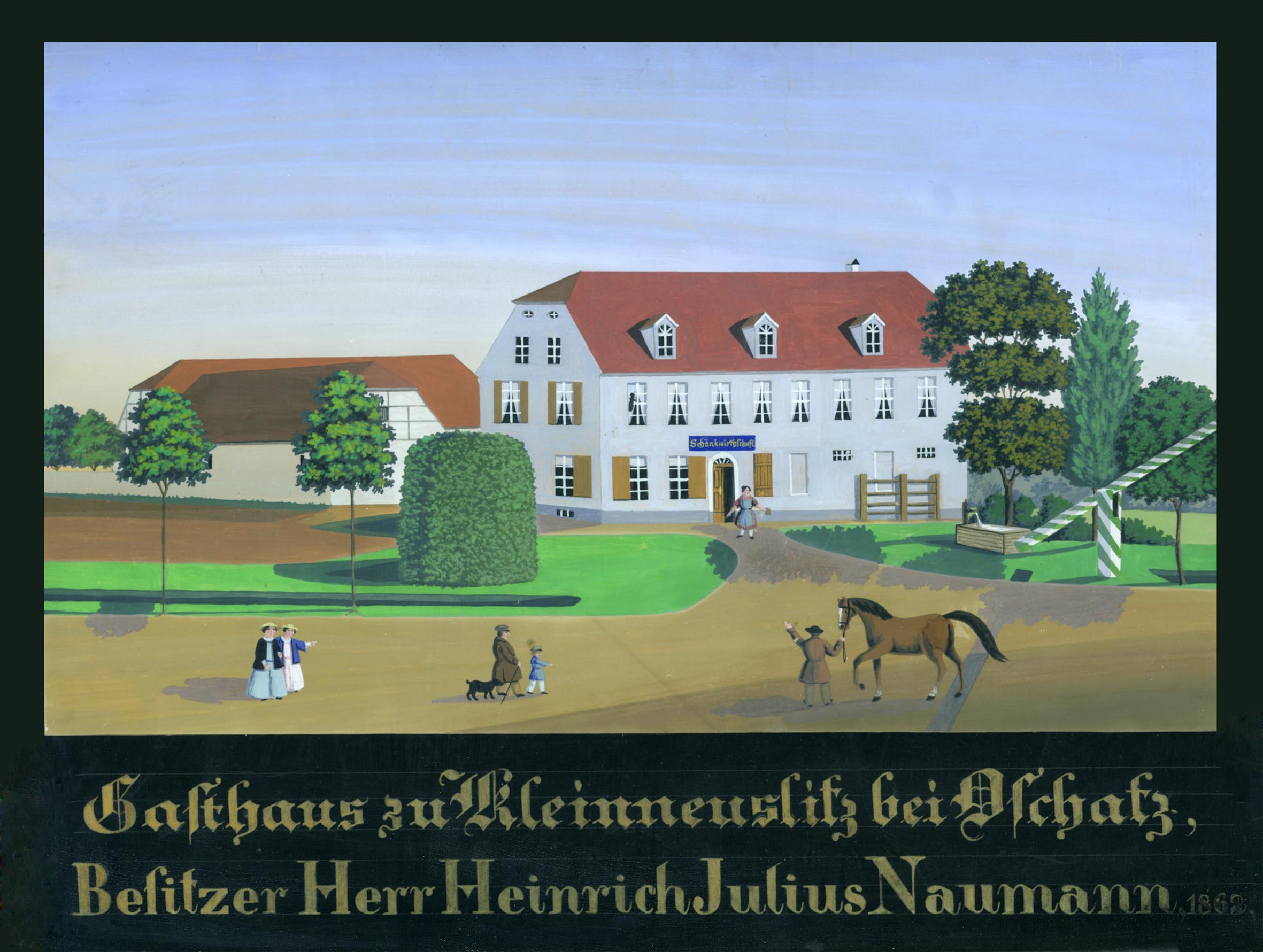 Mitte Februar 1840 berichtete die Sächsische Dorfzeitung, dass dem Hufengutsbesitzer Heinrich ein Stallgebäude total niedergebrannt sei. „Jedenfalls hat eine böswillige Anlegung stattgefunden“. Zwei Jahre darauf, am 19. 02. 1842 starb der beliebte und geschäftstüchtige Landrichter Heinrich im 63. Lebensjahr und hinterließ drei der Kinder aus erster Ehe, sowie zwei unmündigen Kinder aus der 2. Ehe und die Witwe. Der jüngste Sohn, der „Oeconom“ Karl Eduard übernahm das Gut nebst Vieh, Schiff und Geschirr und die zum Nachlass gehörige Weinbude in Lorenzkirchen. Acht Jahre später versteigerten dessen Erben die Immobilien des im Dezember 1850 verstorbenen Nachfolgers und bereits im August 1853 verstarb der neue Besitzer Friedrich Traugott Roßberg aus Merkwitz im 40. Lebensjahr. Dessen Witwe bewirtschaftete das Gut eine zeitlang selbst und verkaufte es dann an den neuen Ehemann Johann Gottfried Zaspel, der die Roßbergsche Konzession 1855 erhielt. Im Februar 1863 bekam Heinrich Julius Naumann die Schankerlaubnis in Kleinneußlitz, der das obenstehende Bild in Auftrag gab.