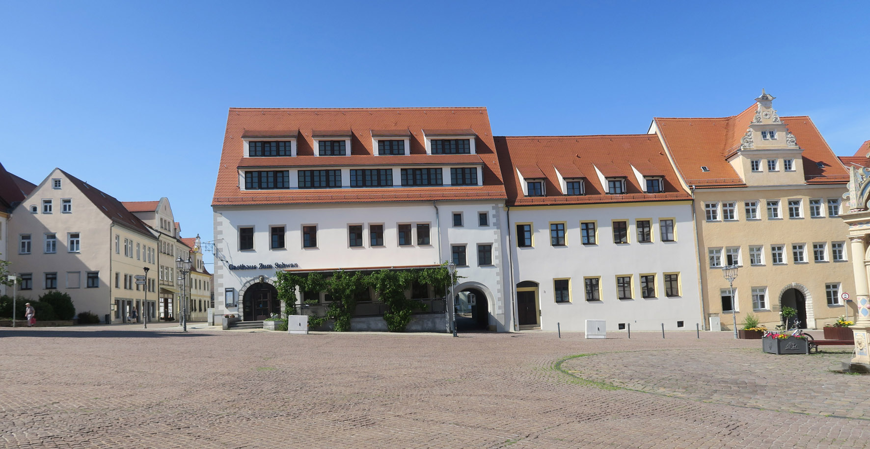 Rechts das heutige Hotel "Gasthaus zum Schwan". Das 1458 ersterwähnte Renaissancegebäude hat den Stadtbrand von 1824 überstanden. Es ist ein historisches Gasthaus an einem seit dem Mittelalter bezeugten Standort, von ortsgeschichtlicher, baugeschichtlicher und sozialgeschichtlicher Bedeutung. Es ist überliefert, dass es zur Ausspanne und Bewirtung der Kauf- und Fuhrleute auf der Via Regia diente.