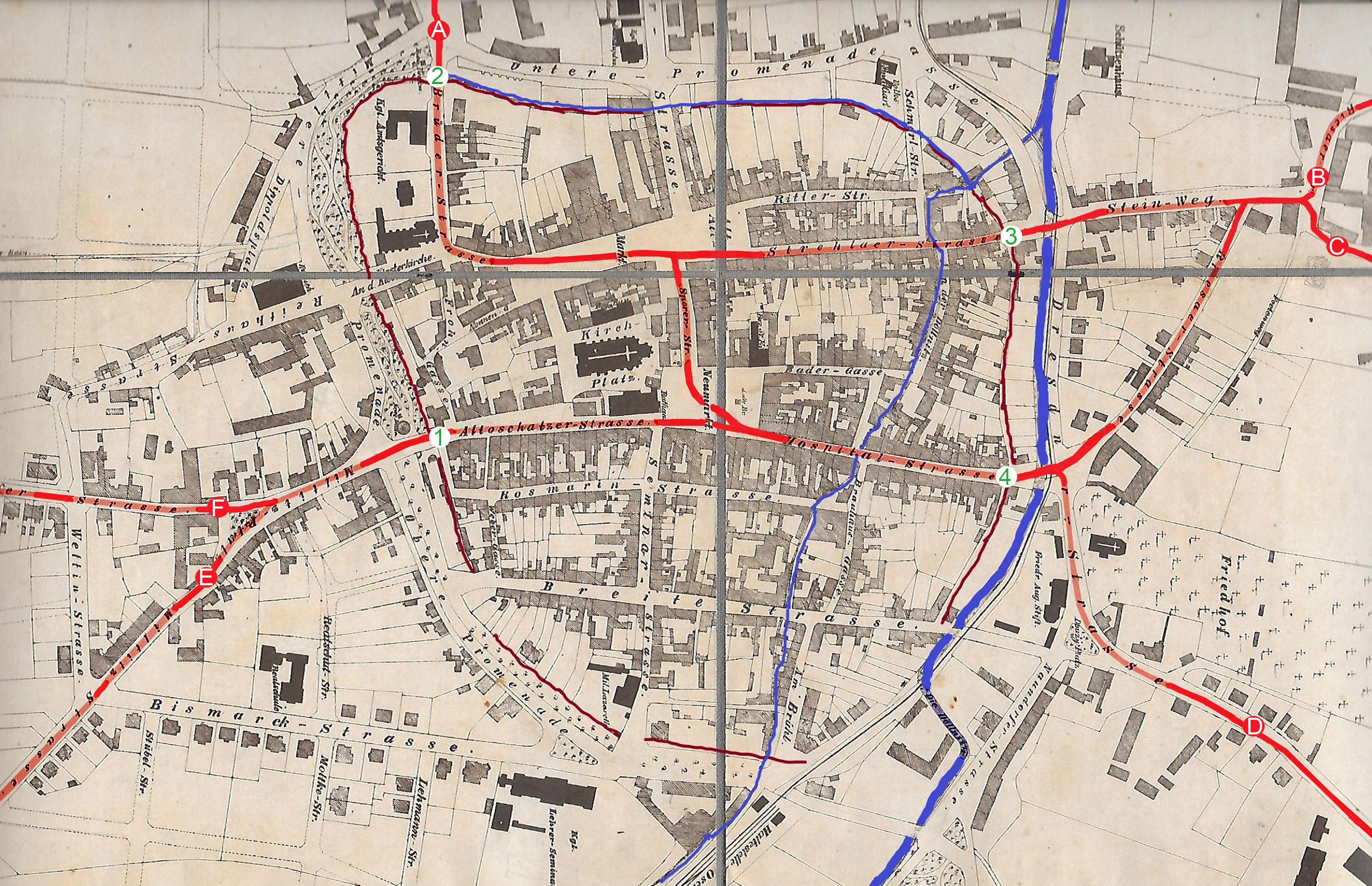 In einem Auszug des Stadtplanes von 1899 sollen die angesprochenen Wege innerhalb und außerhalb von Oschatz dargestellt werden.