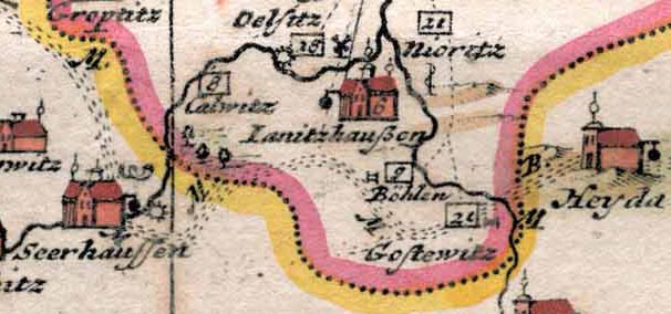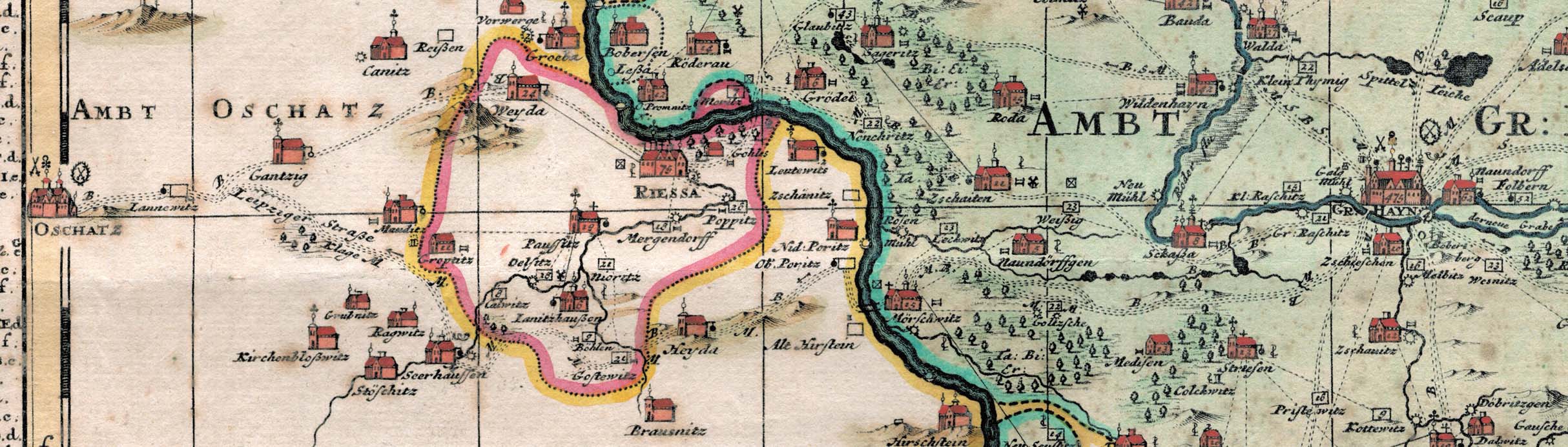 Das Sächsische Staatsarchiv Dresden und die Kartensammlung der Sächsischen Landes- und Universitätsbiblitohek besitzen verschiedene Fassungen der Karte, sowie von Zürner korrigierte Andrucke. Diese Blätter sind als Onlineressurce bei der SLUB verfügbar.2) Verändert wurde bspw. der Verlauf der Leipziger Straße zwischen Lonnewitz bis Nähe Groptitz und zwischen Seerhausen und Gostewitz. Um die in der Originalzeichnung fälschlich nach Norden verschobene Lage von Böhlen, das ja unmittelbar an der Straße liegt, halbwegs zu korrigieren hat der Kartenstecher den ursprünglich gezeigten Verlauf zwischen Seerhausen und Gostewitz an die Ortschaften heran gebogen, wie an restlichen Zeichnungsspuren zwischen Seerhausen und Gostewitz noch sichtbar ist.