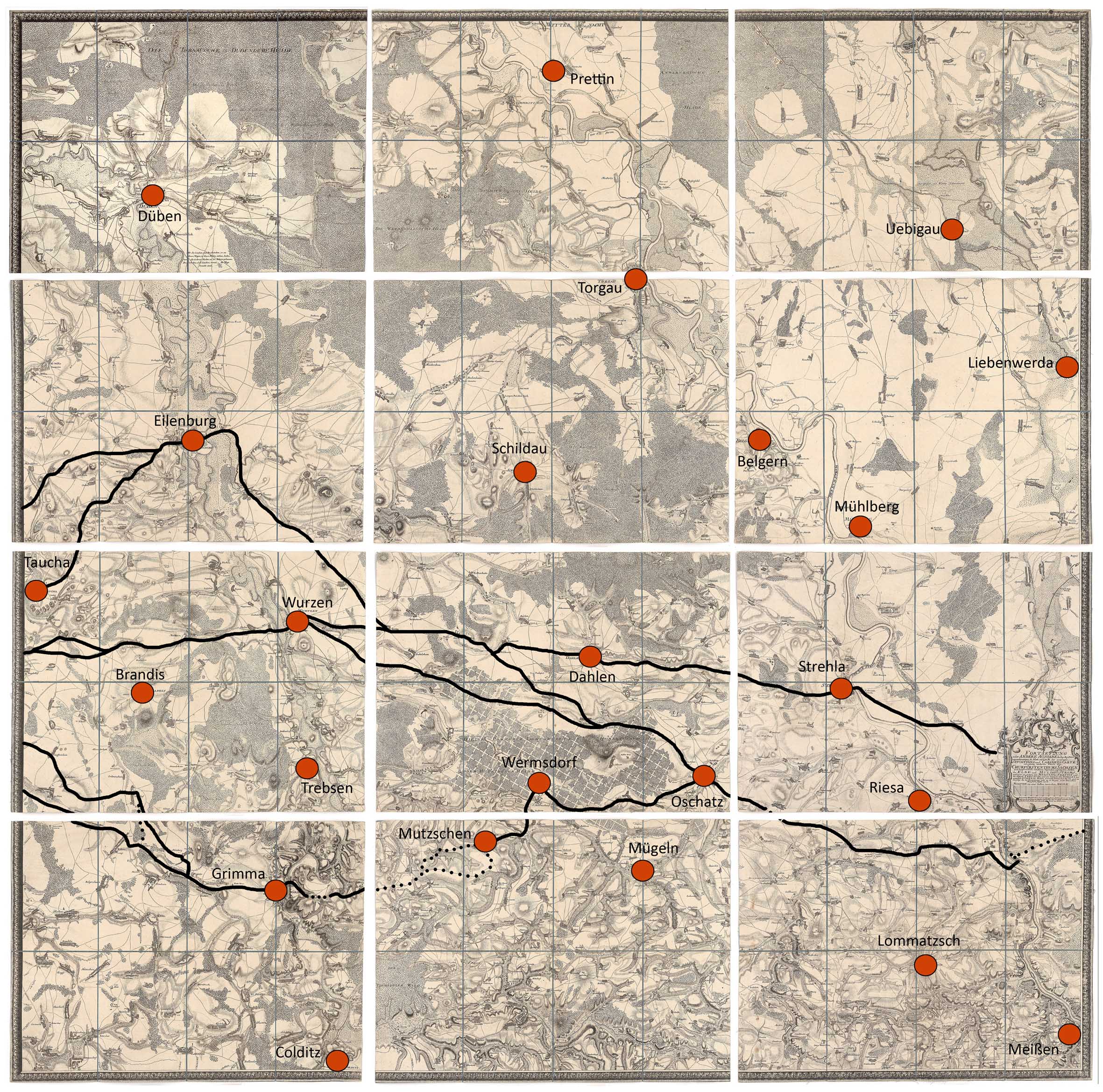 Vorschau der 12 Teilblätter. Darübergelegt (in der Karte nicht enthalten) der angenommene Verlauf der verschiedenen VIA REGIA -Strecken zwischen der Mulde und der Elbe.